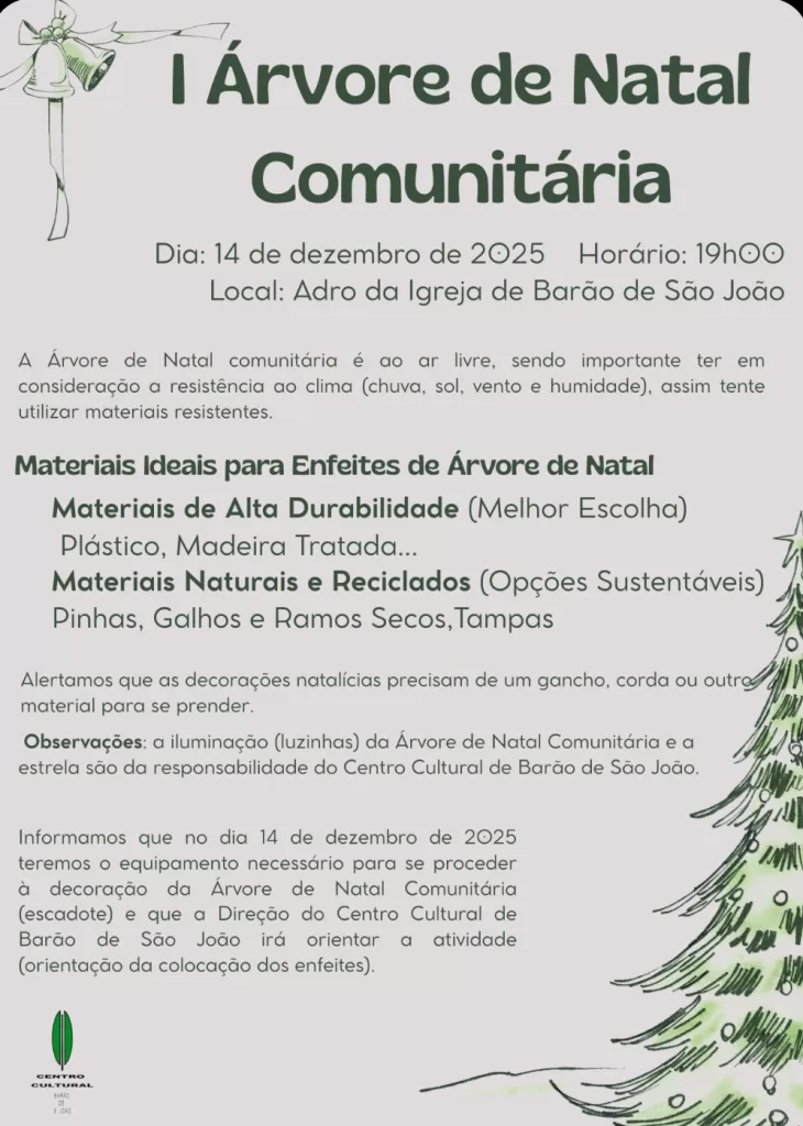Ainda no dia 14, pelas 19h00, será apresentada a Árvore de Natal Comunitária, no Adro da Igreja. A comunidade é convidada a participar trazendo as suas próprias decorações, contribuindo para a construção de uma decoração coletiva que reflete o espírito de união e partilha que caracteriza Barão de São João.